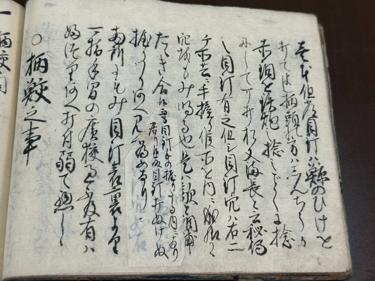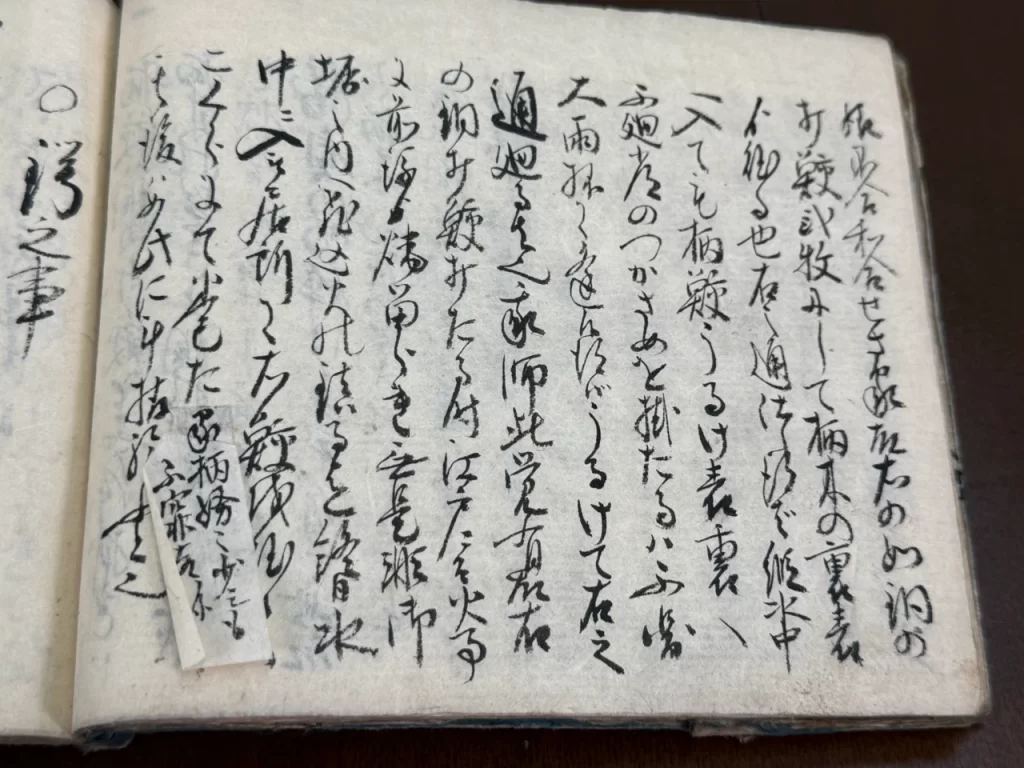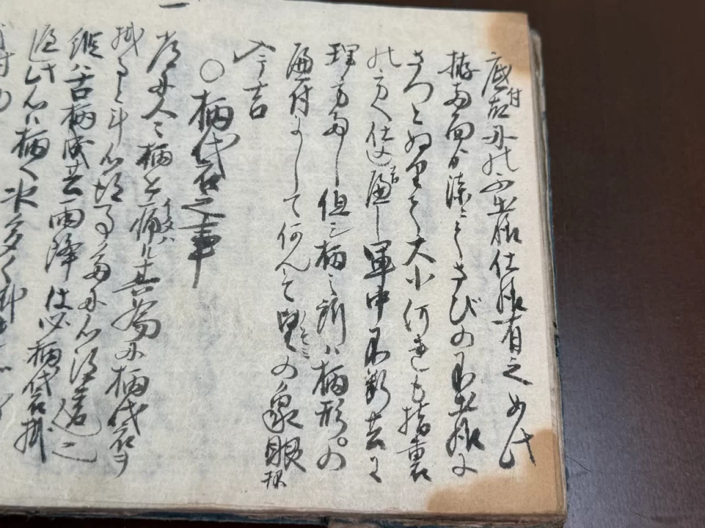 常に人々柄を痛ル、其為に柄袋ヲ掛ると斗心得る多に心得違也、縦ハ古柄成共雨降は必柄袋掛へし、此心ハ柄へ水多く掛れば勝負之時働きの為にちやまになり悪シ、此故に不断ハ勿論旅をする時ハ柄袋を不放持もの也、夏なと晴天にて不図夕立村雨抔逢事あるものなれハ柄袋ハ不断心掛持者也、然共如此なれハとて不断柄掛指ハ大キニ不用心也、千万ぬき合する事有時柄袋取間に余程間の有事なれハ早業のおくれに成也、有人雨の降時合羽内へ大小の頭を入テ指たる故、敵に逢而抜合かね、うたれたる間合羽ゟ大小の柄ハ出し指もの也、我師夕立に逢常の鮫を掛、柄袋不掛、鮫うるけ表裏廻し也
