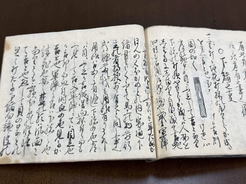 即図の如く 此如蛇口を明けれバ常の蛇口ゟ目ニ不立して吉となり、下緒の打様やわらか成ルハ人抔をしばるにしまり自由ニ成て吉、蛇口付も右用候時の為也、或は軍陣ニて首抔取時に小刀かふかいニて耳たふかほんのくほかのとの内へ突通、下緒貫きくゝりて、馬上の物歩行立の者持様前ニ有之と同し事也、或ハ腰当の代ニも用様有り、其外用様ハ色々有へし、下緒の色常ニハ目ニ不立か吉、縦不図血抔付候而も不見して吉、又軍陣ニてハ目立色か吉、却而血付時血の色見るか吉と也、軍陣之節ハ下緒之色紺花色抔之藍の類ハ風雨に当りても不損、尤色の性強して吉と也、惣して貝の口なとの堅く打たる下緒勿論皮の下緒抔ハ自由ニ不成ほとけ安無益也、不可用、脇指之下緒も和か成る理方ニ吉となり、是も人をしばるに楊枝留抔或は馬上時せきなと馬をはねさする時、鍔の透へ下緒を仮ニ引通置事も有用様色々口伝