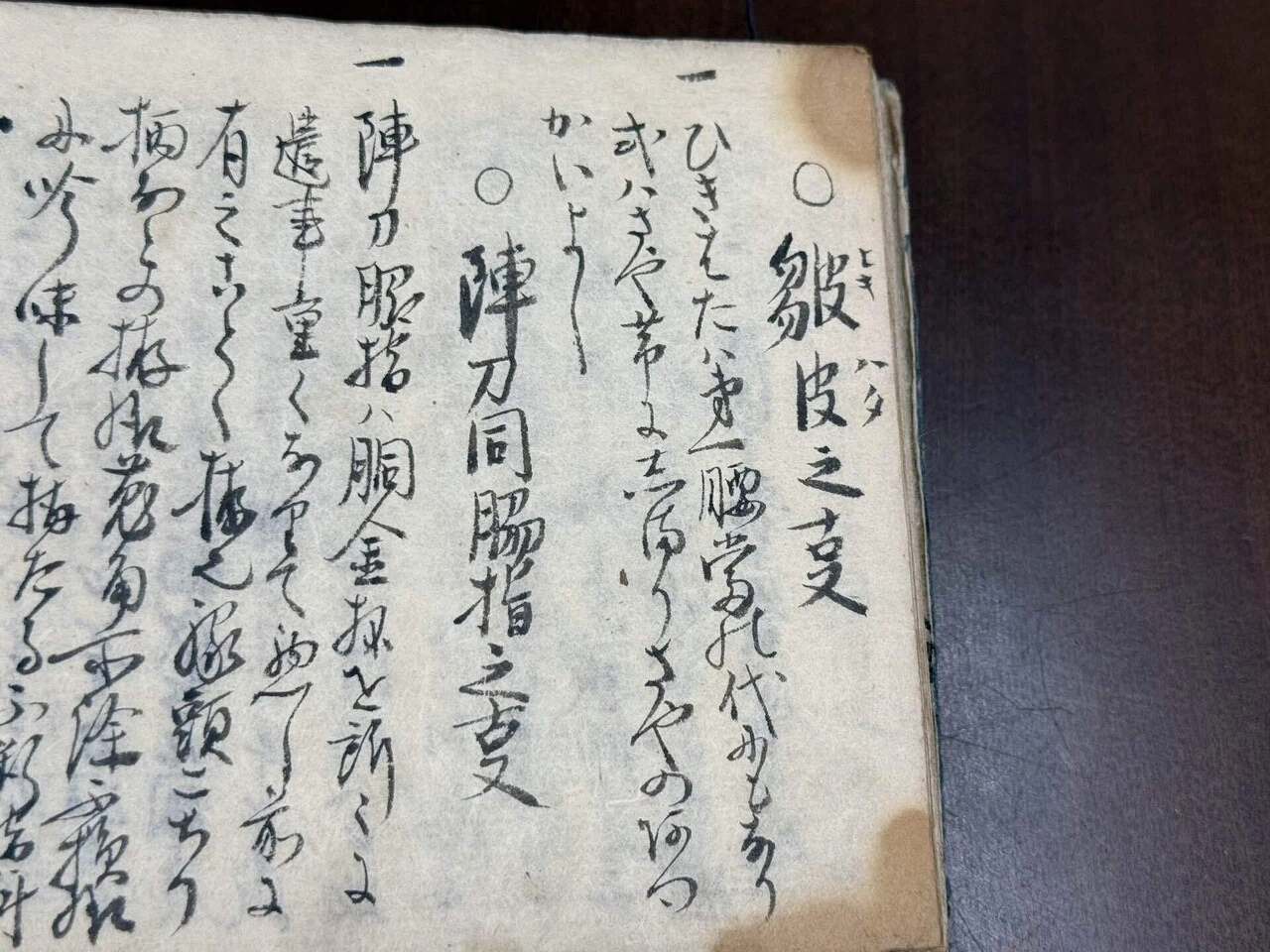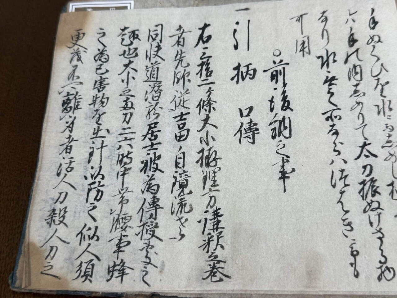 陣刀脇指ハ胴金等を所々に遣事重くなりて悪し、前に有之ことく拵也、縁頭こちり柄なとの拵様兎角所詮不損様に吟味して拵たる、不断指料は引はたを懸目に不立様ニ拵へ差たるハ理用多して吉と也、軍前の引はたハもよう目立ハ吉、常の引はたハ模様不目立かよし