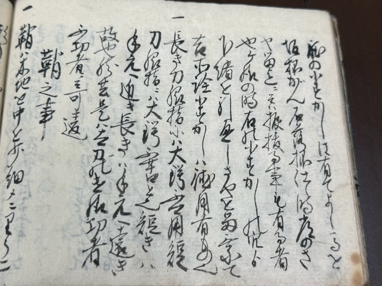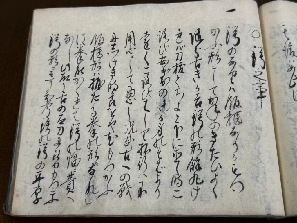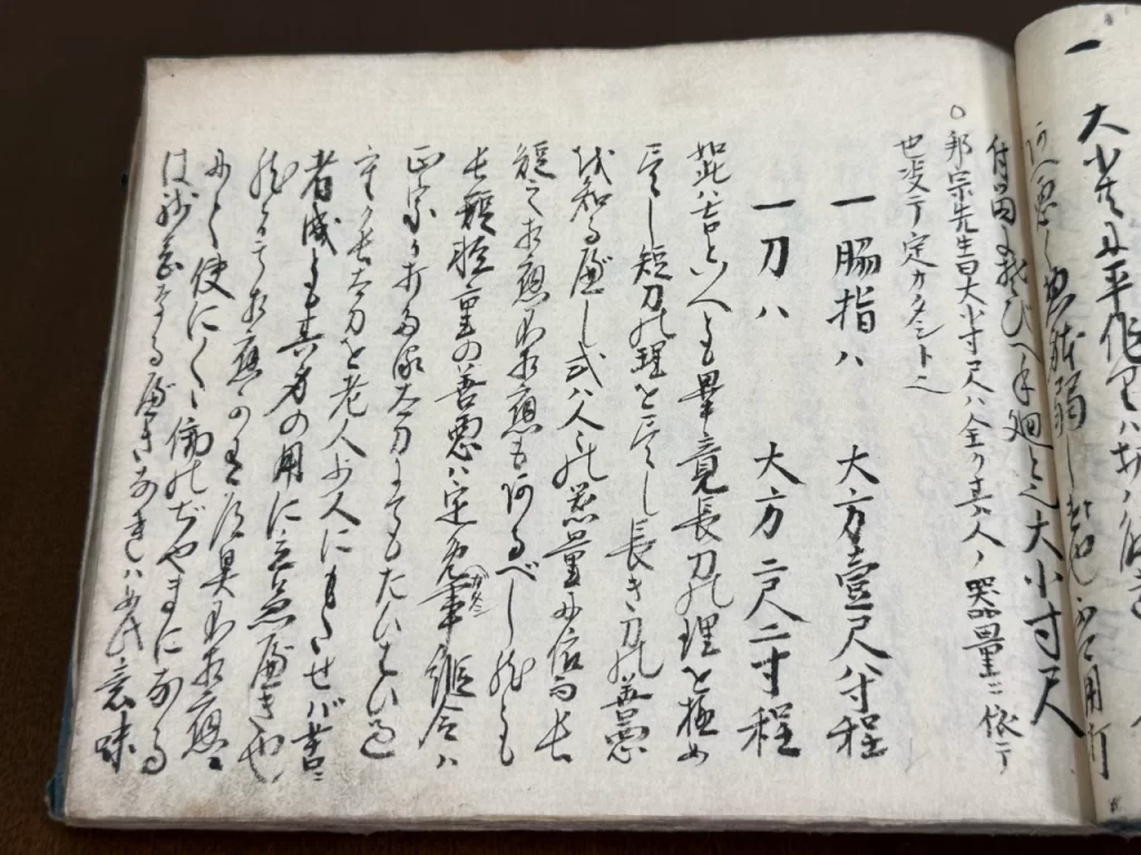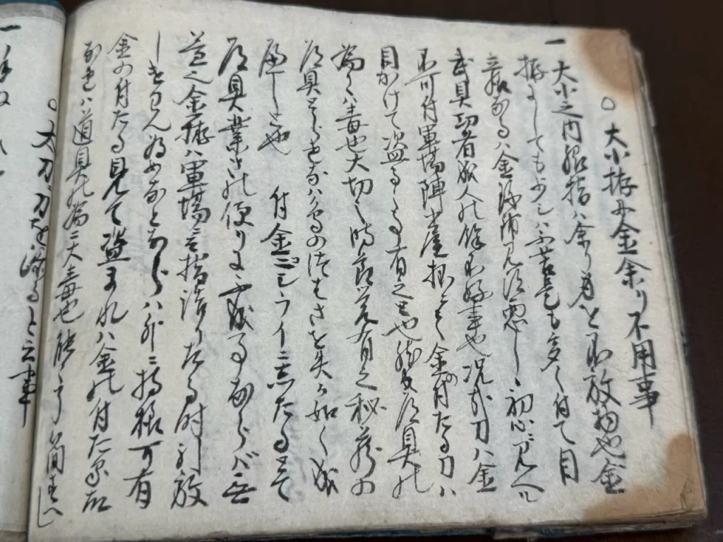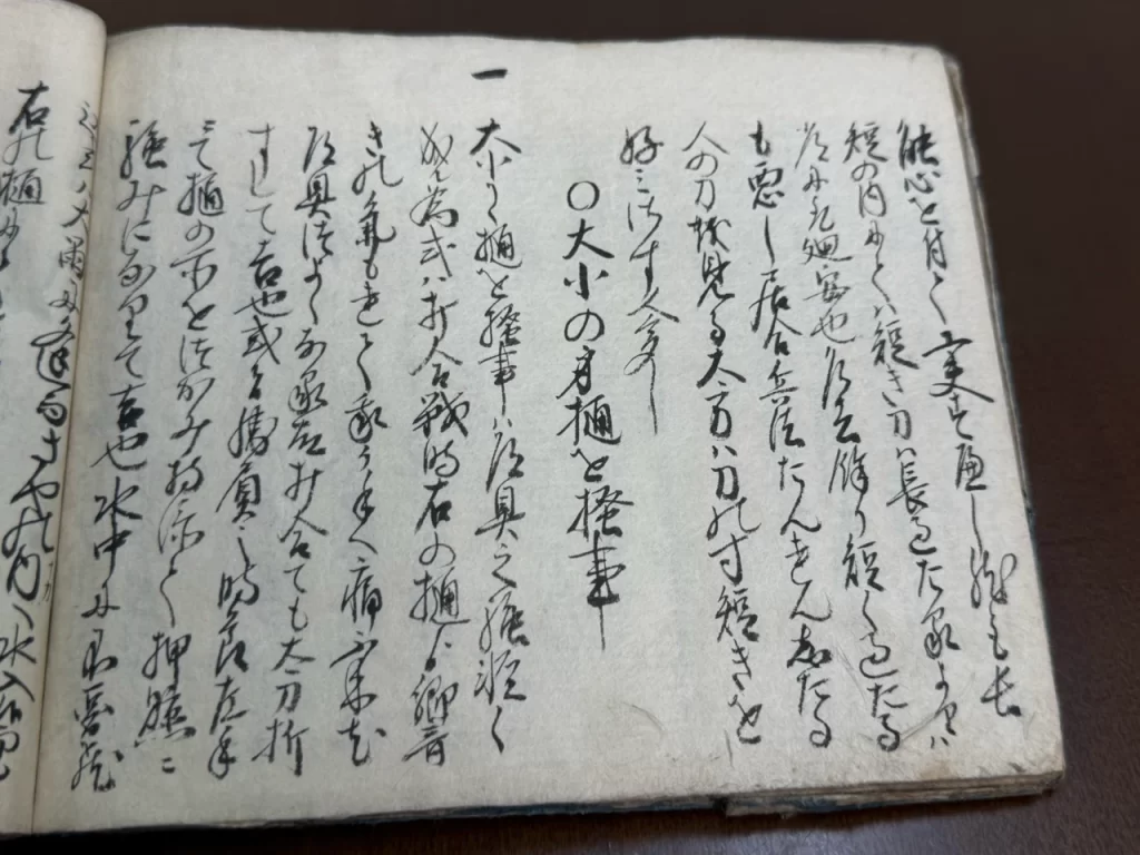 大小共ニ第一指領ハたいはい余過もせすすかれもせす、丈夫なる形にて金味沸へきたひ能上作之古身を数度我かためして見て大役ものならバたとへ柄鞘幾通りも代柄代鞘拵置、小サ刀抔ニも仕、兎角我覚への有之大小身不断我身をはなさぬ様持へし、如此覚有大小懸替共に三通程有之ハ沢山也