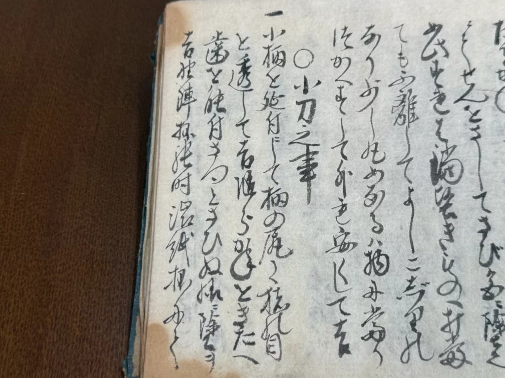 小サ刀ハ勝負を試て覚之有指料を替柄替さやをして用て吉、随分念を入て叶様に吟味すへし、小刀ニ差様口伝