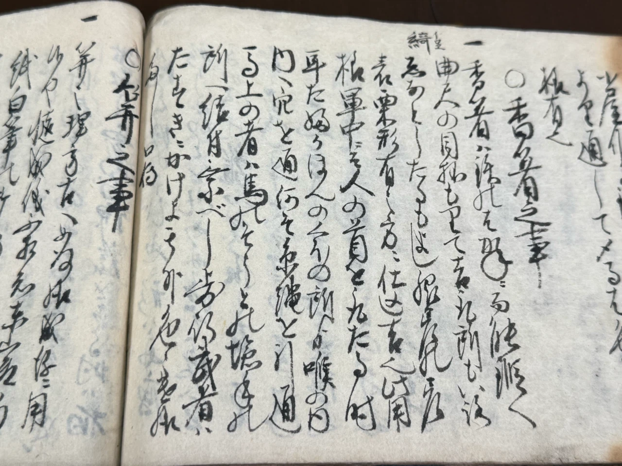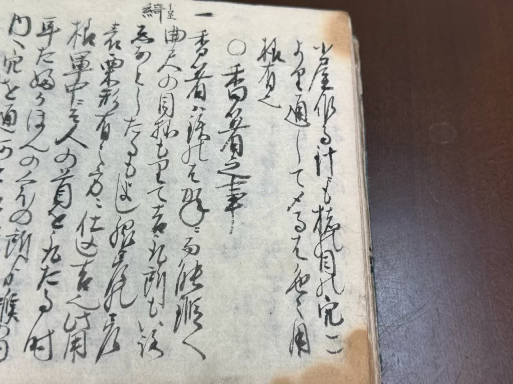 香箸ハ鉄のはかねニ而能鍛へ曲尺の目抔もりて吉、取所も綺なとしたるもよし、脇指の差表栗形有之方ニ仕込吉也、此用様軍中ニて人の首を取たる時耳たふかほんのくほの所ゟ喉の内内へ穴を通、何そ糸縄を引通馬上の者ハ馬のそうとの塩手の所へ結付乗べし、歩行武者ハたすきニかけよ、其外色々遣様多し口伝