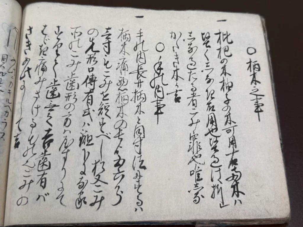 柄鮫ハ銅の打鮫を其侭掛れハ柄木の堅きと銅の打鮫の堅きと揉合、和合せす柄木痛て勝負の時砕ける事有之、此故に柄木へ地皮をきせて其上ニ右の銅打鮫を柄木の裏表へ計弐枚に切候を掛て、柄のむねと刃かたと両所の合目へハ常の柄鮫の能きを鮫の粒をすり落し取て、間皮之厚く強きを掛、扨黒塗へし、但右の銅の打鮫を柄木へくるりと皆くろ懸れバ、かねの鮫故堅くして柄木へ思ふ様不合和合せさる故、右の如銅の打鮫弐枚にして柄木の裏表ゟ懸る也、右之通仕候得ば、縦水中へ入ても柄鮫うるけ表裏へ不廻、常のつかさめを掛たるハ不図大雨抔に逢候得バうるけて右之通廻る者也、我師此覚有故、右の銅打鮫打たる時、江戸ニて火事に前後ゟ燃留られ、無是非御掘之内へ飛込火の鎮る迄終日水中ニ入被居所に、右鮫を懸てこくらにて巻たる柄妙々少シも不故弥其後ハ如此に斗拵給ふと也