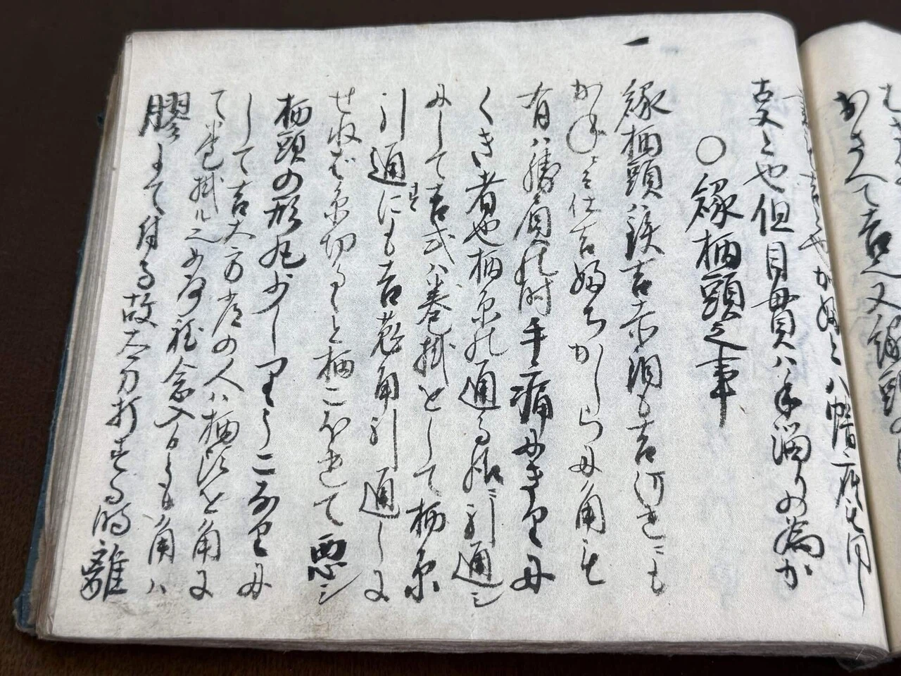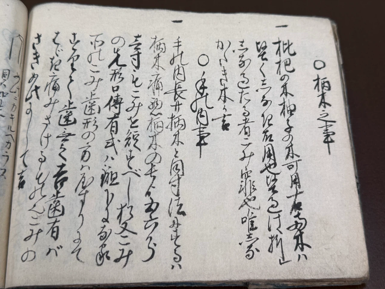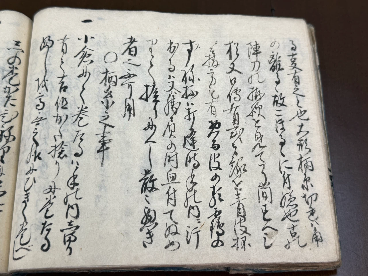 縁柄頭ハ鉄吉赤銅も吉、何れニもかねニて仕吉、ふちかしらに角も有ハ勝負の時手痛にきりにくき者也、柄糸の通る様ニ引通シにして吉、或ハ巻掛をして柄糸引通すにも吉、兎角引通しにせねば糸切るゝと柄こほれて悪シ、柄頭の形丸少しりうこなりにして吉、大方常の人ハ柄頭を角にて巻掛ル也、如何程念入候とも角ハ膠にて付る故、太刀打する時離る事有之と也、大形柄糸切れハ角の離るゝ故こほるゝに付嫌也、古の陣刀の拵様を見て了簡すへシ、猶又口伝有或は縁を青皮抔ニ而拵方も有、惣而皮の類靏のすね抔ハ打逢時手の内ニ汗出るハ又ハ勝負の時血付てぬめりて握りにくし、散々悪き者也、不可用