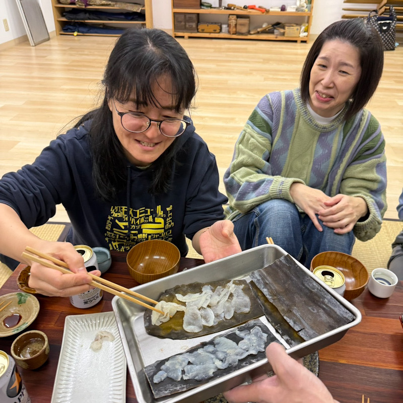 先日、会員の有志とフグ釣りに出かけ、釣り上げたフグを数日寝かせたうえで、稽古に集まった皆で刺身と鍋を囲みました。