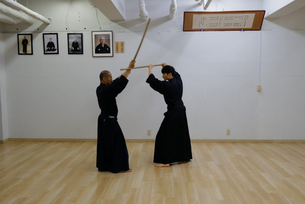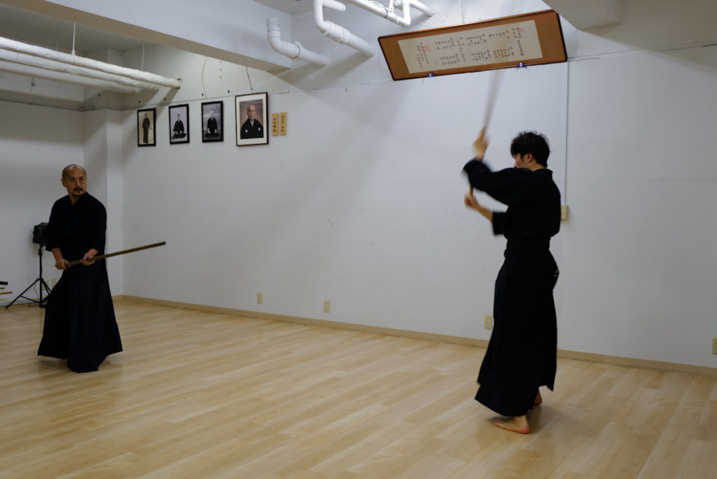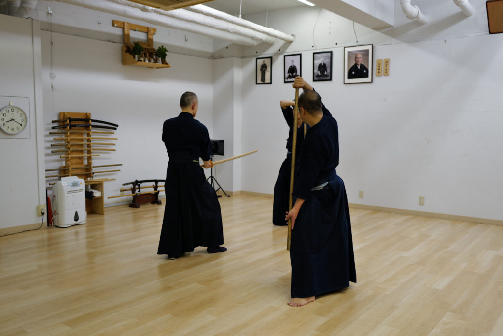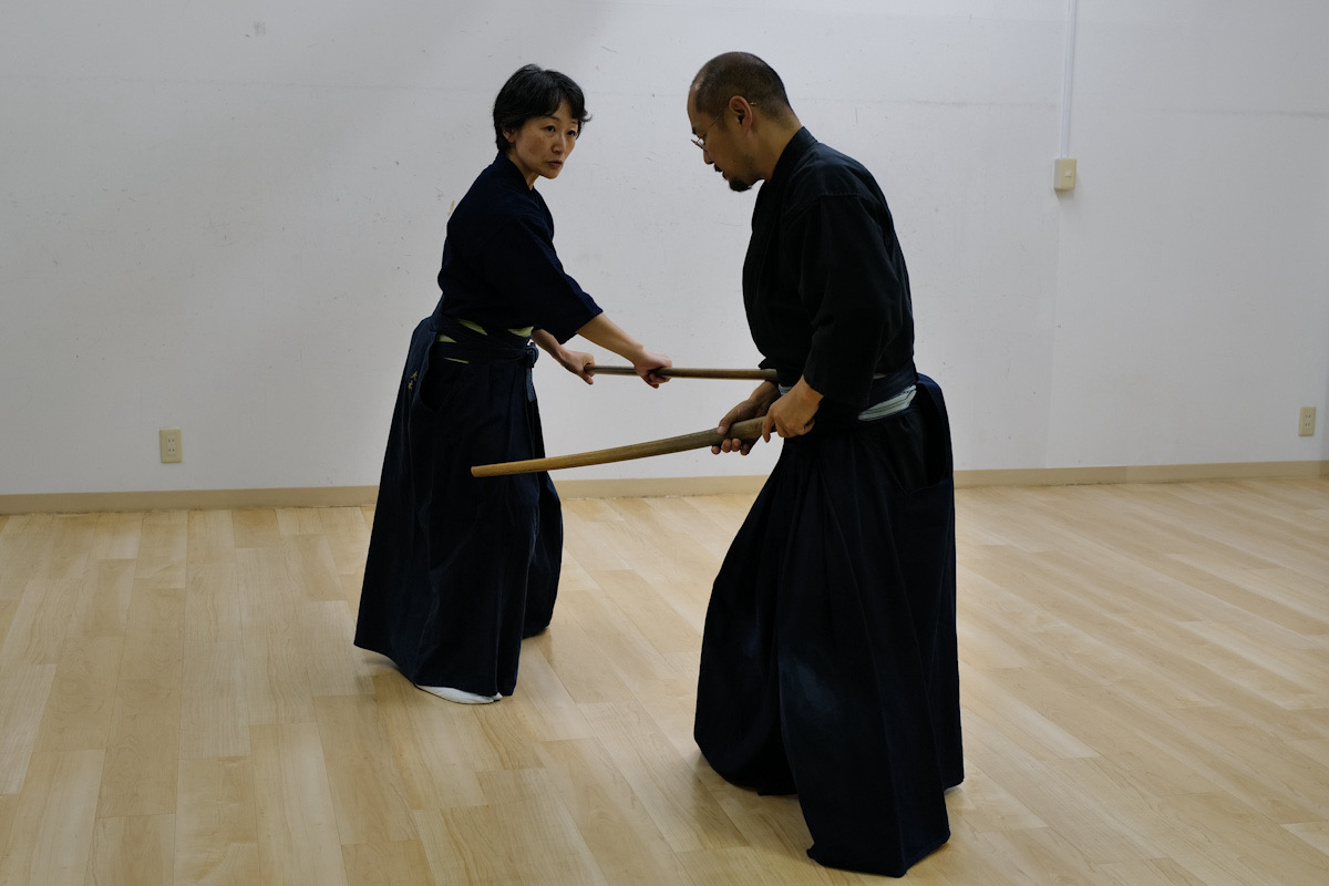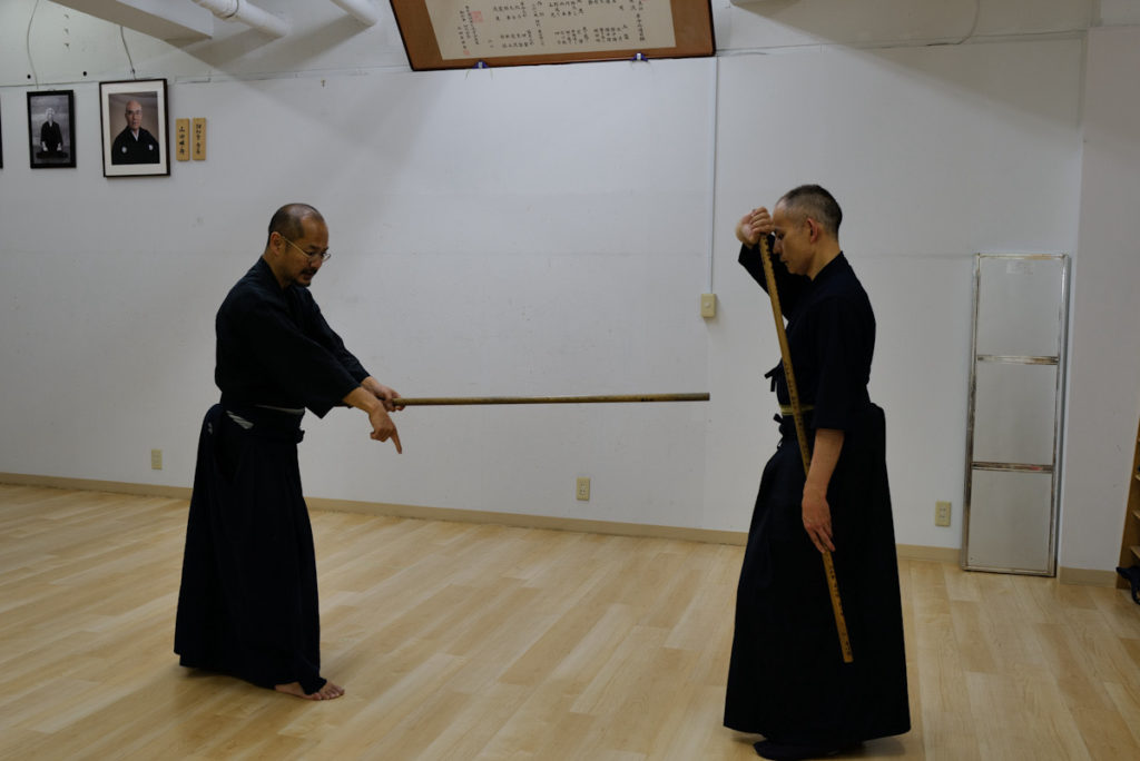 日曜日の神道夢想流杖術。形の動きを覚えたら、太刀と稽古します。太刀が斬ってくるまで待ちましょう。