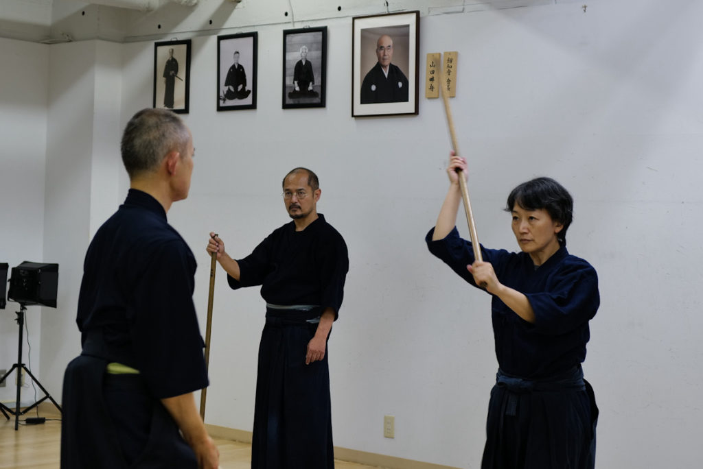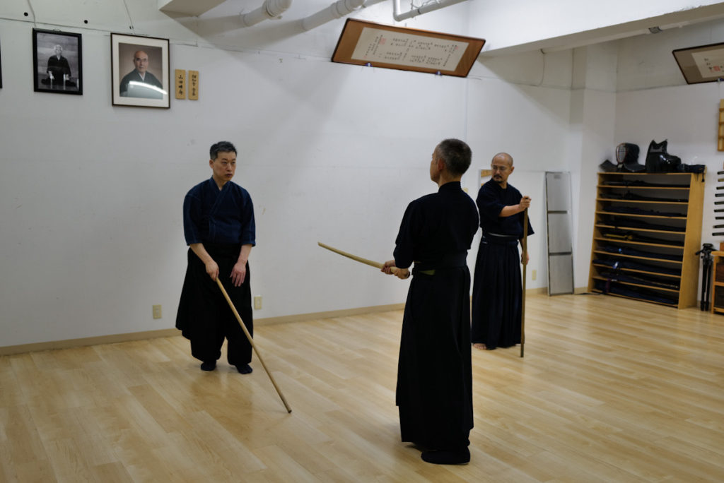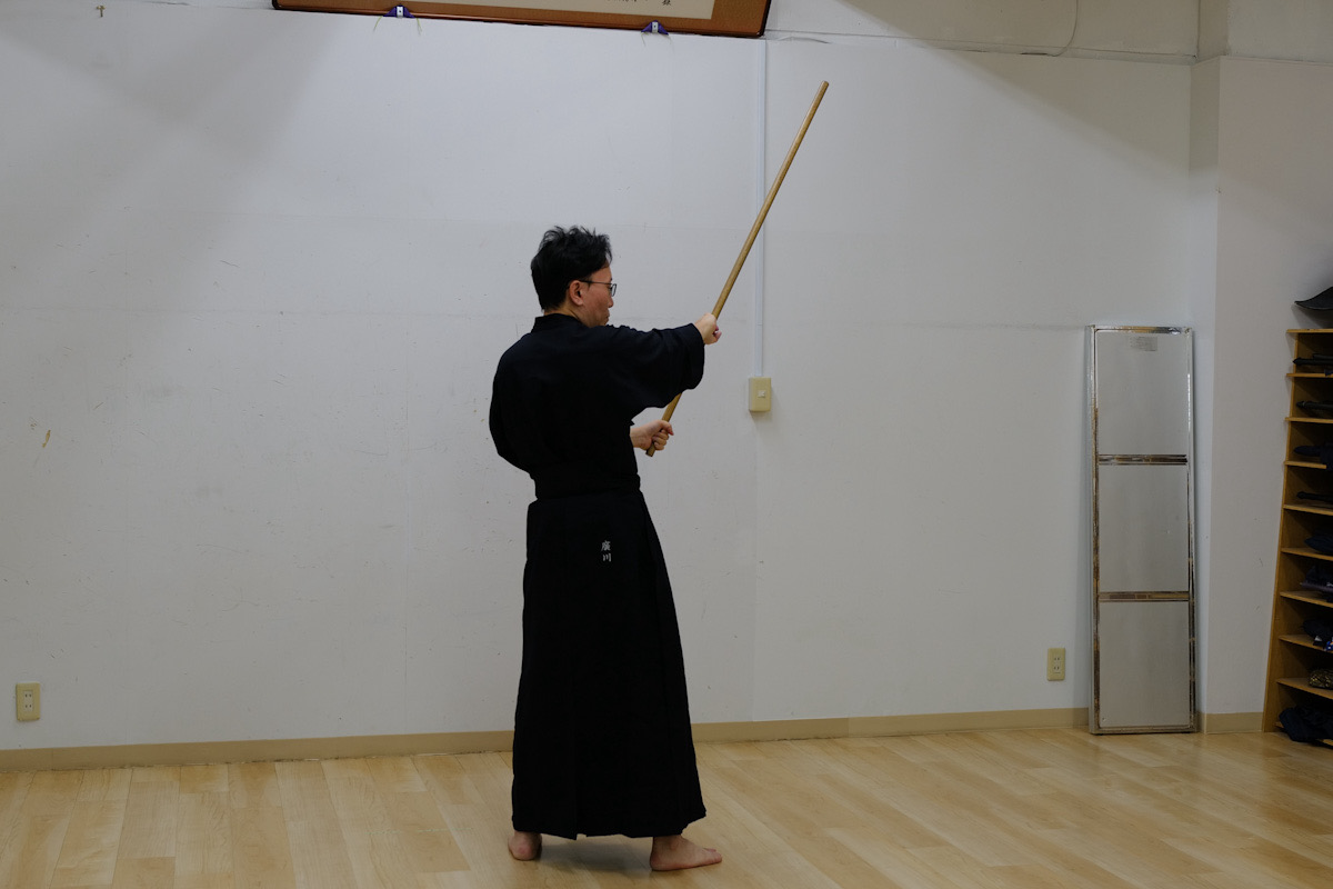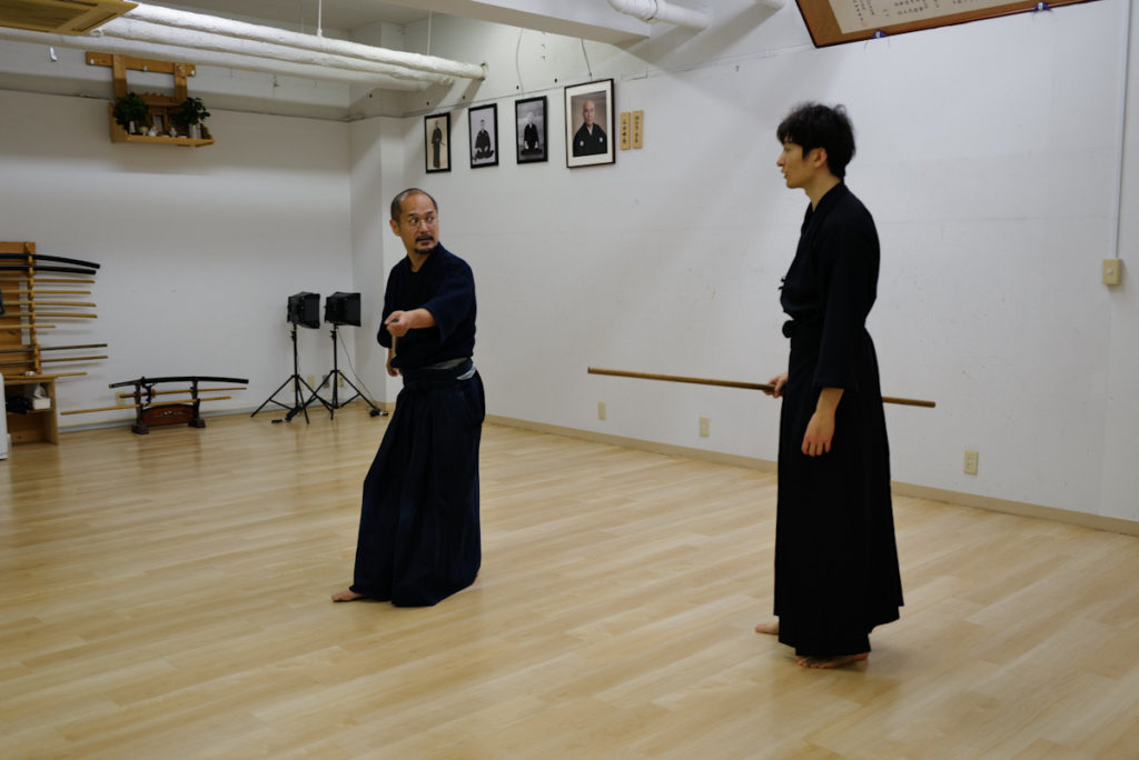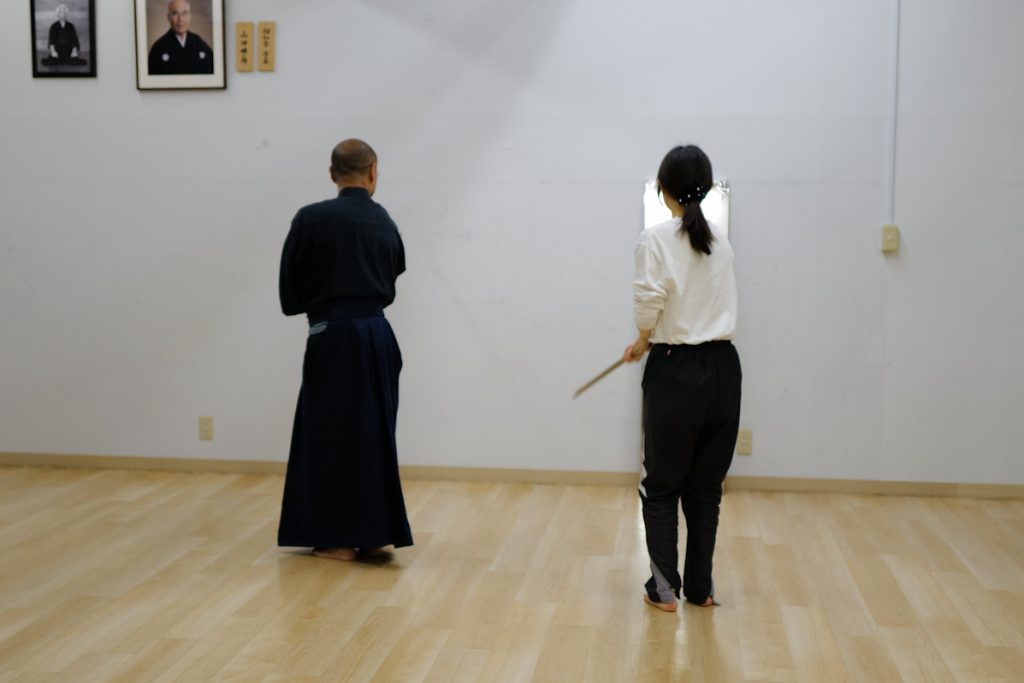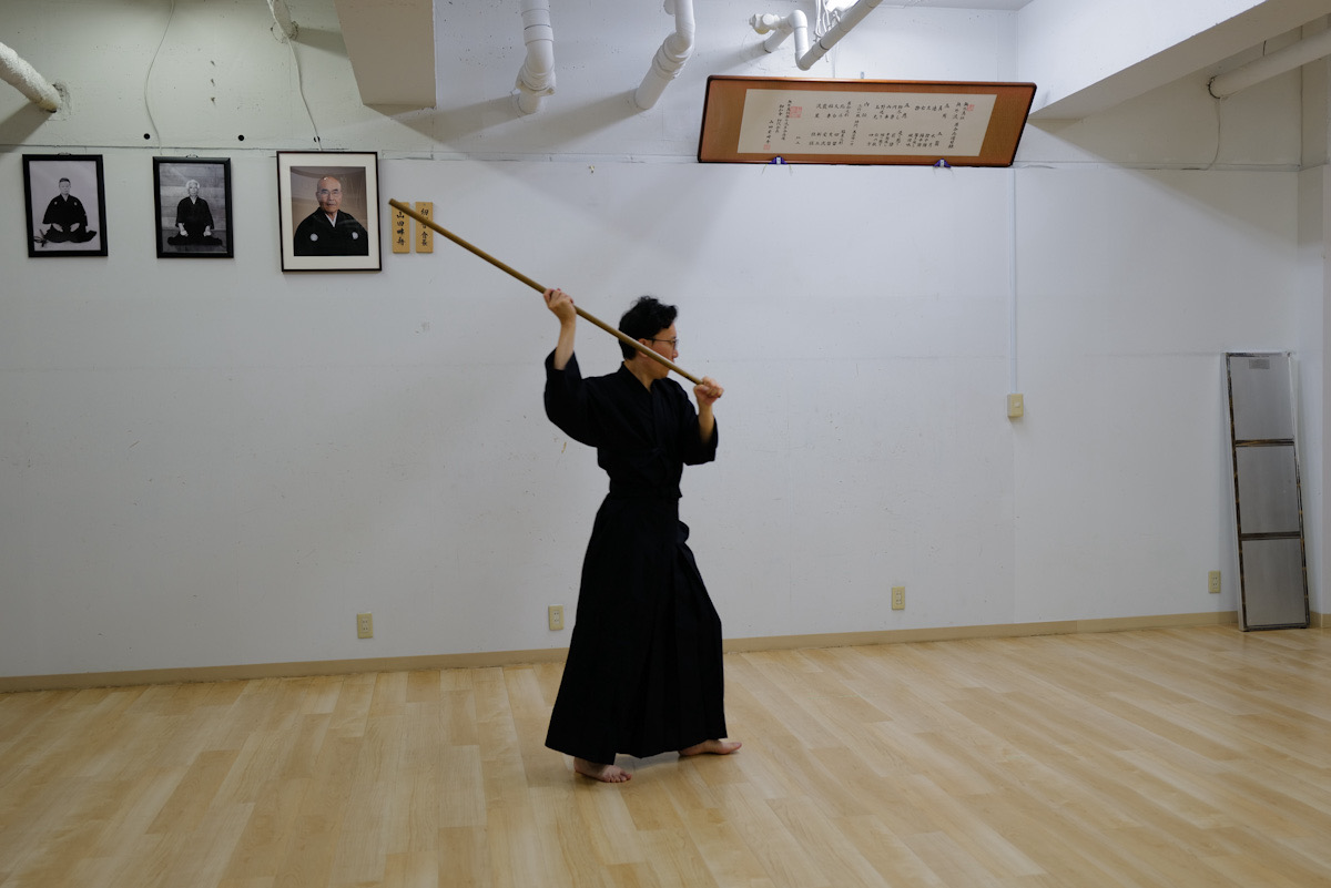 日曜日の神道夢想流杖術。形の動きを覚えたら、太刀と稽古します。太刀が斬ってくるまで待ちましょう。